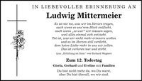 in liebevoller erinnerung an Ludwig Mittermeier Es ist nie tot, was wir im Herzen tragen, auch wenn es uns'rem Blick entflieht, auch wenn "es war" wir müssen sagen, weil alles einmal sich entzieht. Tot ist, was wir nicht mehr erinnern wollen und so im Herzen still verdirbt, dem keine Liebe mehr in uns wir zollen. Das ist verloren nur und stirbt. (aus "Erfüllung im Sinn" von Richard Wagner) Zum 12. Todestag Gisela, Gerhard und Eveline mit Familien Du bist nicht mehr da, wo Du warst, aber Du bist überall, wo wir sind.