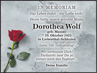 In Memoriam Das Leben endet - die Liebe nicht! Heute hätte unsere geliebte Mama Dorothea Wolf geb. Massny * 29. Oktober 1925 in Liebenthal-Schlesien ihren 100. Geburtstag! Wir vermissen Dich! Vielleicht liest Du ja immer noch das Tagblatt ... Deine Familie