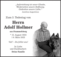 'Der Mensch, den wir lieben, ist nicht mehr da, wo er war, aber überall dort, wo wir sind und seiner gedenken.' Zum 2. Todestag von Herrn Adolf Hollmer aus Frammelsberg * 15. August 1934 + 6. März 2023 Vatl - Du fehlst uns! In Liebe und Dankbarkeit: Deine Familie'Auferstehung ist unser Glaube, Wiedersehen unsere Hoffnung, Gedenken unsere Liebe.' Aurelius Augustinus Zum 3. Todestag von Herrn Adolf Hollmer aus Frammelsberg * 15. August 1934 + 6. März 2023 Vatl' - Du fehlst uns! In Liebe und Dankbarkeit: Deine Familie