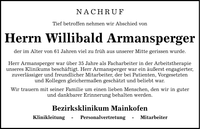 NACHRUFTief betroffen nehmen wir Abschied vonHerrn Willibald Armanspergerder im Alter von 61 Jahren viel zu früh aus unserer Mitte gerissen wurde.Herr Armansperger war über 35 Jahre als Facharbeiter in der Arbeitstherapieunseres Klinikums beschäftigt. Herr Armansperger war ein äußerst engagierter,zuverlässiger und freundlicher Mitarbeiter, der bei Patienten, Vorgesetztenund Kollegen gleichermaßen geschätzt und beliebt war.Wir trauern mit seiner Familie um einen lieben Menschen, den wir in guter und dankbarer Erinnerung behalten werden.Bezirksklinikum MainkofenKlinikleitung - Personalvertretung - Mitarbeiter