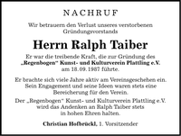 nachrufWir betrauern den Verlust unseres verstorbenenGründungsvorstandsHerrn Ralph TaiberEr war die treibende Kraft, die zur Gründung des"Regenbogen" Kunst- und Kulturverein Plattling e.V.am 18. 09. 1987 führte.Er brachte sich viele Jahre aktiv am Vereinsgeschehen ein. Sein Engagement und seine Ideen waren stets eineBereicherung für den Verein.Der "Regenbogen" Kunst- und Kulturverein Plattling e.V. wird das Andenken an Ralph Taiber stetsin hohen Ehren halten.Christian Hofbrückl, 1. Vorsitzender
