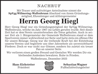 NACHRUF Mit Trauer und aufrichtiger Anteilnahme nimmt die SpVgg Willmering-Waffenbrunn Abschied von ihrem Gründungs­mitglied, Ehrenbürger und Altbürgermeister Herrn Georg Hiegl Herr Georg Hiegl war ein Gründungsmitglied der SpVgg Willmering-Waffenbrunn, welche im Jahr 1967 ins Leben gerufen wurde. Seit dieser Zeit hat er dem Verein ununterbrochen die Treue gehalten. Auch in seiner Zeit als 1. Bürgermeister der Gemeinde Waffenbrunn stand er dem Sportverein immer wohlwollend zur Seite und hatte stets ein offenes Ohr für unsere Belange. Georg war die treibende Kraft bei der Entstehung unseres Vereins und begleitete uns über Jahrzehnte als unverzichtbarer Förderer. Doch er war nicht nur Gönner, sondern bis zuletzt ein treuer Fan an unserer Seite. Wir verlieren einen großen Freund und Gestalter. Wir werden Dir ein bleibendes Andenken bewahren. Ruhe in Frieden. Waffenbrunn, Dezember 2025 Hans Eichstetter Sebastian Wagner Präsident Fußballabteilungsleiter