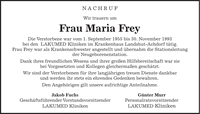 N a c h r u f Wir trauern um Frau Maria Frey Die Verstorbene war vom 1. September 1955 bis 30. November 1993 bei den LAKUMED Kliniken im Krankenhaus Landshut-Achdorf tätig. Frau Frey war als Krankenschwester angestellt und übernahm die Stationsleitung der Neugeborenenstation. Dank ihres freundlichen Wesens und ihrer großen Hilfsbereitschaft war sie bei Vorgesetzten und Kollegen gleichermaßen geschätzt. Wir sind der Verstorbenen für ihre langjährigen treuen Dienste dankbar und werden ihr stets ein ehrendes Gedenken bewahren. Den Angehörigen gilt unsere aufrichtige Anteilnahme. Jakob Fuchs Günter Murr Geschäftsführender Vorstandsvorsitzender Personalratsvorsitzender LAKUMED Kliniken LAKUMED Kliniken