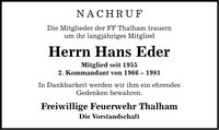 NACHRUF Die Mitglieder der FF Thalham trauern um ihr langjähriges Mitglied Herrn Hans Eder Mitglied seit 1955 2. Kommandant von *** In Dankbarkeit werden wir ihm ein ehrendes Gedenken bewahren. Freiwillige Feuerwehr Thalham Die Vorstandschaft