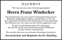 NACHRUF Wir trauern um unser Gründungsmitglied Herrn Franz Windecker Der Verstorbene war seit unserer Vereinsgründung treues Mitglied, großzügiger Gönner und Sponsor, er war ein gern gesehener Freund des FC Zeholfing. Er half tatkräftig bei Arbeiten mit, die rund um den Verein angefallen sind. Er galt als pflichtbewusster FC-Anhänger, der sich im Laufe von Jahrzehnten große Verdienste um den Verein erworben hat. Wir werden ihm stets ein ehrendes Gedenken bewahren. Vorstandschaft und Mitglieder des FC Zeholfing