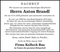 NACHRUF Wir trauern um unseren ehemaligen Mitarbeiter Herrn Anton Brandl der am 27.01.2026 plötzlich und unerwartet verstorben ist. Er war von 1968 bis zum Rentenbeginn 2018 über 40 Jahre bei uns als zuverlässiger Maurer beschäftigt. Anton war vor allem für seine vielseitigen handwerklichen Fähigkeiten bei unseren Kunden sehr beliebt. Wir bedanken uns bei ihm für seine langjährige Betriebstreue und stets gute Zusammenarbeit sowie für seinen kameradschaftlichen Umgang mit seinen Kollegen. Wir werden ihm stets ein ehrendes Gedenken bewahren. Done, vielen Dank! Ruhe in Frieden. Furth im Wald, Januar 2026 Firma Kolbeck Bau im Namen der gesamten Belegschaft