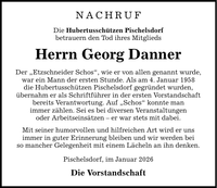 NACHRUF Die Hubertusschützen Pischelsdorf betrauern den Tod ihres Mitglieds Herrn Georg Danner Der "Etzschneider Schos", wie er von allen genannt wurde, war ein Mann der ersten Stunde. Als am 4. Januar 1958 die Hubertusschützen Pischelsdorf gegründet wurden, übernahm er als Schriftführer in der ersten Vorstandschaft bereits Verantwortung. Auf "Schos" konnte man immer zählen. Sei es bei diversen Veranstaltungen oder Arbeitseinsätzen - er war stets mit dabei. Mit seiner humorvollen und hilfreichen Art wird er uns immer in guter Erinnerung bleiben und wir werden bei so mancher Gelegenheit mit einem Lächeln an ihn denken. Pischelsdorf, im Januar 2026 Die Vorstandschaft