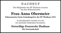NACHRUF Die Mitglieder der FF Thalham trauern um ihre Fahnenmutter Frau Anna Obermeier Fahnenmutter beim Gründungsfest der FF Thalham 1978 In Dankbarkeit werden wir ihr ein ehrendes Gedenken bewahren. Freiwillige Feuerwehr Thalham Die Vorstandschaft