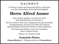 nachruf In Trauer nimmt die Gemeinde Pfatter Abschied von dem ehemaligen Gemeinderatsmitglied Herrn Alfred Aumer Herr Aumer gehörte von 1971 bis 1978 dem Gemeinderat in Gmünd an. Er hat in dieser Zeit seine Aufgaben stets gewissenhaft wahrgenommen und sich zum Wohl der damals eigenständigen Gemeinde Gmünd verdient gemacht. Die Gemeinde Pfatter wird sein Andenken stets in Ehren halten. Pfatter, 27. Oktober 2025 Gemeinde Pfatter Johann Biederer, 1. Bürgermeister mit Gemeinderat