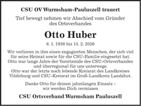 CSU OV Wurmsham-Pauluszell trauert Tief bewegt nehmen wir Abschied vom Gründer des Ortsverbandes Otto Huber 6. 1. 1936 bis 15. 2. 2026 Wir verlieren in ihm einen engagierten Menschen, der sich viel für seine Heimat sowie für die CSU-Familie eingesetzt hat. Otto war lange Jahre der Vorsitzende des CSU-Ortsverbandes und überregional für uns unterwegs. Otto war der letzte noch lebende Kreisrat des Landkreises Vilsbiburg und CSU-Kreisrat im Groß-Landkreis Landshut. Danke Otto für deinen jahrelangen Einsatz - wir werden Dich vermissen CSU Ortsverband Wurmsham Pauluszell