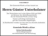 NACHRUF Die Gemeinde Wörth a.d.Isar trauert um Herrn Günter Unterholzner Der Verstorbene war in den Jahren 2019 und 2020 als Betreuer der Altstoffsammelstelle für die Gemeinde Wörth a.d.Isar tätig. Unsere aufrichtige Anteilnahme gilt den trauernden Angehörigen. In Dankbarkeit werden wir ihm stets ein ehrendes Andenken bewahren. Gemeinde Wörth a.d.Isar Stefan Scheibenzuber Erster Bürgermeister mit Gemeinderat und Verwaltung