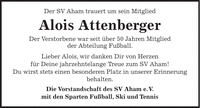 Der SV Aham trauert um sein Mitglied Alois Attenberger Der Verstorbene war seit über 50 Jahren Mitglied der Abteilung Fußball. Lieber Alois, wir danken Dir von Herzen für Deine jahrzehntelange Treue zum SV Aham! Du wirst stets einen besonderen Platz in unserer Erinnerung behalten. Die Vorstandschaft des SV Aham e. V. mit den Sparten Fußball, Ski und Tennis