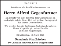 NACHRUF Die Gemeinde Straßkirchen trauert um Herrn Alfred Gegenfurtner Er gehörte von 1987 bis 2002 dem Gemeinderat an und setzte sich in dieser Zeit mit großem Engagement für unsere Gemeinde ein. Wir werden ihm ein dankbares Andenken bewahren. Unser Mitgefühl gilt seiner Familie und allen Angehörigen. Straßkirchen, 18. April 2026 Gemeinde Straßkirchen Dr. Christian Hirtreiter, Erster Bürgermeister