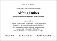 NACHRUF Wir trauern um Stadtheimatpfleger Alfons Huber langjähriger Autor in unserer Heimatzeitung Lieber Alfons, Du hast unser Leben als Freund, Lehrer und Autor in unserer Heimatzeitung immer bereichert! Wir werden die vielen schönen Begegnungen mit Dir über die vielen Jahrzehnte immer erinnern und bleiben dankbar dafür. Christa Balle Dr. Hermann Balle Prof. Dr. Martin Balle