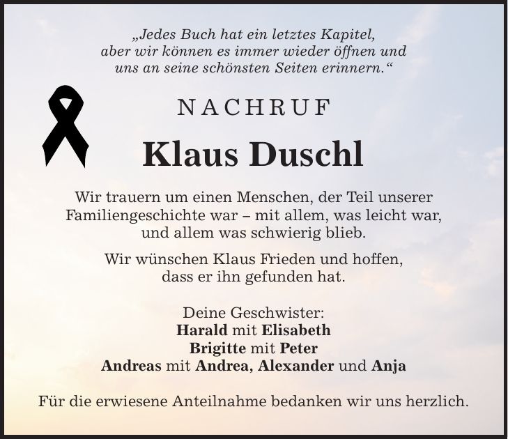 "Jedes Buch hat ein letztes Kapitel, aber wir können es immer wieder öffnen und uns an seine schönsten Seiten erinnern." NACHRUF Klaus Duschl Wir trauern um einen Menschen, der Teil unserer Familiengeschichte war _ mit allem, was leicht war, und allem was schwierig blieb. Wir wünschen Klaus Frieden und hoffen, dass er ihn gefunden hat. Deine Geschwister: Harald mit Elisabeth Brigitte mit Peter Andreas mit Andrea, Alexander und Anja Für die erwiesene Anteilnahme bedanken wir uns herzlich.