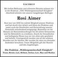 NACHRUF Mit tiefem Bedauern und schweren Herzens müssen wir in der Fraktion 'CSU-Wählergemeinschaft Einigkeit' Abschied nehmen von unserer langjährigen Kollegin Rosi Aimer Rosi war von 2002 bis zuletzt Mitglied unserer Fraktion und hat durch ihre Arbeit und Ideen die Fraktion und somit auch die Geschichte und Entwicklung unserer Gemeinde entscheidend mitgeprägt. Besonders sei ihr Einsatz als Seniorenbeauftragte für die ältere Generation und für Behinderte zu erwähnen. Durch ihr freundliches und kollegiales Wesen war sie von allen sehr geschätzt und beliebt. Unvergesslich werden uns all die schönen Stunden mit ihr bleiben. Wir werden ihr stets ein ehrendes Andenken bewahren. Unser Mitgefühl gilt der Familie und den Angehörigen. Die Fraktion 'Wählergemeinschaft Einigkeit' Franz, Bernie, Lois, Helmut, Stefan, Lars, Max und Markus