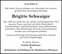 Nachruf Mit tiefer Trauer nehmen wir Abschied von unserer geschätzten ehemaligen Kollegin Brigitte Schwaiger Von 1991 bis 2016 war sie loyaler und kompetenter Teil unseres Teams und hat mit ihrer Ehrlichkeit, Verlässlichkeit und Kollegialität unser Miteinander bereichert. Ihre Erfahrung und ihre Lebensweisheit werden uns unvergessen bleiben. Unsere aufrichtige Anteilnahme gilt ihrer Familie und allen Angehörigen. In stiller Trauer: Familie Boniberger & Kolleginnen und Kollegen des Modehauses Oberpaur