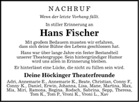 NACHRUF Wenn der letzte Vorhang fällt. In stiller Erinnerung an Hans Fischer Mit großem Bedauern mussten wir erfahren, dass sich deine Bühne des Lebens geschlossen hat. Hans war über lange Jahre ein fester Bestandteil unserer Theatergruppe. Sein hintergründiger Humor wird uns allen in Erinnerung bleiben. Er hinterlässt eine Lücke, die nicht zu füllen sein wird. Deine Höckinger Theaterfreunde Adri, Annemarie E., Annemarie K., Beate, Christian, Conny F., Conny K., Daniel, Erwin, Johanna, Lisa, Mane, Martina, Max, Mia, Miri, Ramona, Regina, Rodsch, Sabrina, Sepp, Theresa, Tom K., Tom P., Vroni K., Vroni L., Xav