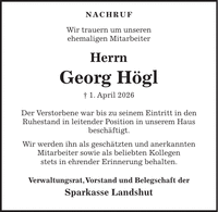 NACHRUF Wir trauern um unseren ehemaligen Mitarbeiter Herrn Georg Högl + 1. April 2026 Der Verstorbene war bis zu seinem Eintritt in den Ruhestand in leitender Position in unserem Haus beschäftigt. Wir werden ihn als geschätzten und anerkannten Mitarbeiter sowie als beliebten Kollegen stets in ehrender Erinnerung behalten. Verwaltungsrat, Vorstand und Belegschaft der Sparkasse Landshut