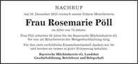 Nachruf Am 26. Dezember 2025 verstarb unsere frühere Mitarbeiterin Frau Rosemarie Pöll im Alter von 72 Jahren. Frau Pöll arbeitete 26 Jahre für die Bayerische Milchindustrie eG. Sie war als Mitarbeiterin der Mengenbuchhaltung tätig. Für ihre stets vorbildliche Einsatzbereitschaft danken wir ihr und werden sie immer in guter Erinnerung behalten. Bayerische Milchindustrie eG, Landshut Geschäftsführung, Betriebsrat und Belegschaft