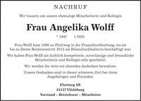 Nachruf Wir trauern um unsere ehemalige Mitarbeiterin und Kollegin Frau Angelika Wolff * 1947 + 2025 Frau Wolff kam 1996 zu Flottweg in die Finanzbuchhaltung, wo sie bis zu Ihrem Renteneintritt 2012 als Bilanzbuchhalterin beschäftigt war. Wir haben Frau Wolff als fachlich kompetente, zuverlässige und freundliche Mitarbeiterin und Kollegin sehr geschätzt. Wir werden ihr stets ein ehrendes Andenken bewahren. Unsere Gedanken sind in dieser schweren Zeit bei ihren Angehörigen und Freunden. Flottweg SE 84137 Vilsbiburg Vorstand - Betriebsrat - Mitarbeiter