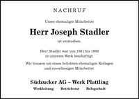 NACHRUFUnser ehemaliger MitarbeiterHerr Joseph Stadlerist verstorben. Herr Stadler war von 1981 bis 1993in unserem Werk beschäftigt. Wir trauern um einen beliebten ehemaligen Kollegenund zuverlässigen Mitarbeiter. Südzucker AG - Werk Plattling Werkleitung Betriebsrat Belegschaft