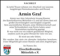 NACHRUF In tiefer Trauer nehmen wir Abschied von unserem langjährigen Vereinskameraden und Freund Armin Graf Armin war über Jahrzehnte hinweg Kassier des Eisschießvereins Mitterfels e.V. und hat dieses Amt mit großer Zuverlässigkeit und Sorgfalt ausgeübt. Sein unermüdlicher Einsatz, seine Hilfsbereitschaft und seine Verbundenheit zum Verein haben unser Vereinsleben nachhaltig geprägt. Er war nicht nur ein äußerst geschätztes Mitglied, sondern auch ein guter Freund für viele von uns. Er wird uns sehr fehlen. Wir werden ihm stets ein ehrendes Andenken bewahren. Unser Mitgefühl gilt seiner Familie und allen Angehörigen. Im Namen des Eisschießvereins Mitterfels e.V.