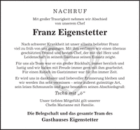 NACHRUF Mit großer Traurigkeit nehmen wir Abschied von unserem Chef Franz Eigenstetter Nach schwerer Krankheit ist unser allseits beliebter Franz viel zu früh von uns gegangen. Mit ihm verlieren wir einen überaus geschätzten Freund und besten Chef, der mit viel Herz und Leidenschaft in seinem Gasthaus seinen Einsatz zeigte. Für uns als Team war er ein großer Rückhalt, immer herzlich und lustig und wir haben mit Freude immer gern mit ihm gearbeitet. Für einen Ratsch im Gastzimmer war für ihn immer Zeit. Er wird uns in dankbarer und liebevoller Erinnerung bleiben und wir werden ihn sehr vermissen - seine äußerst gutmütige Art, sein leises Schmunzeln und ganz besonders seinen Abschiedsgruß: Tschü mit 'ö' Unser tiefstes Mitgefühl gilt unserer Chefin Marianne mit Familie. Die Belegschaft und das gesamte Team des Gasthauses Eigenstetter