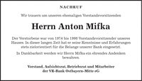 NACHRUF Wir trauern um unseren ehemaligen Vorstandsvorsitzenden Herrn Anton Mifka Der Verstorbene war von 1974 bis 1998 Vorstandsvorsitzender unseres Hauses. In dieser langen Zeit hat er seine Kenntnisse und Erfahrungen stets zielorientiert für die Belange unserer Bank eingesetzt. In Dankbarkeit werden wir Herrn Mifka ein ehrendes Andenken bewahren. Vorstand, Aufsichtsrat, Betriebsrat und Mitarbeiter der VR-Bank Ostbayern-Mitte eG