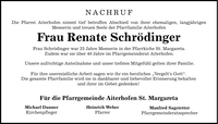 NACHRUFDie Pfarrei Aiterhofen nimmt tief betroffen Abschied von ihrer ehemaligen, langjährigen Mesnerin und treuen Seele der Pfarrfamilie AiterhofenFrau Renate SchrödingerFrau Schrödinger war 25 Jahre Mesnerin in der Pfarrkiche St. Margareta.Zudem war sie über 40 Jahre im Pfarrgemeinderat Aiterhofen.Unsere aufrichtige Anteilnahme und unser tiefstes Mitgefühl gelten ihrer Familie.Für ihre unermüdliche Arbeit sagen wir ihr ein herzliches