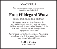 NACHRUF Wir nehmen Abschied von unserem langjährigen Mitglied Frau Hildegard Wutz die seit 1994 Mitglied der KLB war. Hildegard hatte ab 1996 das Amt der Ortsvorsteherin inne und war dazu von 2000 bis 2008 als 1. weiblicher Vorstand tätig. Ein Amt, welches sie mit sehr großem Engagement ausführte. Wir werden ihr stets ein ehrendes Andenken bewahren und drücken den Angehörigen unser tiefes Mitgefühl aus. KLB Döfering Vorstandschaft
