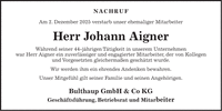 NACHRUF Am 2. Dezember 2025 verstarb unser ehemaliger Mitarbeiter Herr Johann Aigner Während seiner 44-jährigen Tätigkeit in unserem Unternehmen war Herr Aigner ein zuverlässiger und engagierter Mitarbeiter, der von Kollegen und Vorgesetzten gleichermaßen geschätzt wurde. Wir werden ihm ein ehrendes Andenken bewahren. Unser Mitgefühl gilt seiner Familie und seinen Angehörigen. Bulthaup GmbH & Co KG Geschäftsführung, Betriebsrat und Mitarbeiter