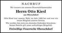Nachruf Wir trauern um unseren Feuerwehrkameraden Herrn Otto Kiesl aus Oberachdorf Otto Kiesl trat unserer Wehr im Jahr 1986 bei und war ein treues Mitglied unseres Vereins. Wir werden ihm stets ein ehrendes Gedenken bewahren. Seiner Familie gilt unser aufrichtiges Mitgefühl. Freiwillige Feuerwehr Oberachdorf