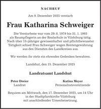 NACHRUF Am 9. Dezember 2025 verstarb Frau Katharina Schweiger Die Verstorbene war vom 29. 8. 1979 bis 31. 1. 1993 als Raumpflegerin an der Realschule in Vilsbiburg tätig. Nach über 13-jähriger gewissenhafter und pflichtbewusster Tätigkeit schied Frau Schweiger wegen Rentengewährung aus den Diensten des Landkreises aus. Wir werden ihr stets ein ehrendes Gedenken bewahren. Landshut, den 15. Dezember 2025 Landratsamt Landshut Peter Dreier Katina Meyer Landrat Personalratsvorsitzende Requiem am Mittwoch, den 17. Dezember 2025, um 14 Uhr in der Stadtpfarrkirche Vilsbiburg mit anschließender Urnenbeisetzung.