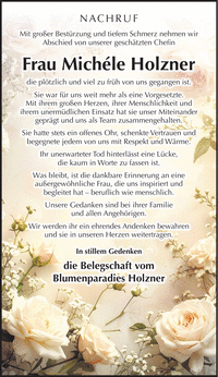 NACHRUF Mit großer Bestürzung und tiefem Schmerz nehmen wir Abschied von unserer geschätzten Chefin Frau Michéle Holzner die plötzlich und viel zu früh von uns gegangen ist. Sie war für uns weit mehr als eine Vorgesetzte. Mit ihrem großen Herzen, ihrer Menschlichkeit und ihrem unermüdlichen Einsatz hat sie unser Miteinander geprägt und uns als Team zusammengehalten. Sie hatte stets ein offenes Ohr, schenkte Vertrauen und begegnete jedem von uns mit Respekt und Wärme. Ihr unerwarteter Tod hinterlässt eine Lücke, die kaum in Worte zu fassen ist. Was bleibt, ist die dankbare Erinnerung an eine außergewöhnliche Frau, die uns inspiriert und begleitet hat - beruflich wie menschlich. Unsere Gedanken sind bei ihrer Familie und allen Angehörigen. Wir werden ihr ein ehrendes Andenken bewahren und sie in unseren Herzen weitertragen. In stillem Gedenken die Belegschaft vom Blumenparadies Holzner