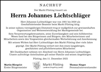 NACHRUF Der Markt Pilsting trauert um Herrn Johannes Lichtschläger Herr Johannes Lichtschläger war von 1981 bis 2020 als Geschäftsleitender Beamter beim Markt Pilsting tätig. In seiner nahezu vierzigjährigen Dienstzeit trug er maßgeblich zur gewissenhaften Organisation und Weiterentwicklung der Marktgemeinde bei. Sein Verantwortungsbewusstsein, seine Zuverlässigkeit und sein hilfsbereites Wesen fand bei den Bürgerinnen und Bürgern, den Mitarbeiterinnen und Mitarbeitern sowie den Vorgesetzten gleichermaßen Wertschätzung und Anerkennung. Mit seinem Wirken hat Herr Lichtschläger den Markt Pilsting über viele Jahre geprägt. Der Markt Pilsting verliert mit ihm einen langjährigen, geschätzten und pflichtbewussten Mitarbeiter. Mit Dankbarkeit nehmen wir Abschied von Herrn Johannes Lichtschläger. Unsere aufrichtige Anteilnahme gilt seiner Familie und seinen Angehörigen. Pilsting, den 11. Dezember 2025 Martin Hiergeist Erster Bürgermeister Thomas Singer Personalratsvorsitzender