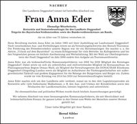 NACHRUF Der Landkreis Deggendorf nimmt tief betroffen Abschied von Frau Anna Eder Ehemalige Mitarbeiterin, Kreisrätin und Seniorenbeauftragte für den Landkreis Deggendorf Trägerin des Bayerischen Verdienstordens sowie des Bundesverdienstkreuzes am Bande, die im Alter von 75 Jahren verstorben ist. Ihren Berufsweg startete Anna Eder im Jahre 1965 mit ihrer Ausbildung am Landratsamt Deggendorf. Nach verschiedenen Aus- und Fortbildungen leitete sie als Verwaltungsfachwirtin den Bereich Tourismus. Die Förderung des Fremdenverkehrs unserer Region war ihr ein Herzensanliegen. Sie machte u. a. die Aktion 'Urlaub auf dem Bauernhof' zu einem Erfolgsrezept für viele Betriebe. Im Kollegenkreis und bei den Vorgesetzten genoss sie höchste Anerkennung und Wertschätzung. Mit der Wahl zur Oberbürgermeisterin der Stadt Deggendorf im Jahr 2000 endete ihre Aufgabe als Tourismusreferentin. Anna Eder war als leidenschaftliche Kommunalpolitikerin von 2002 bis 2020 Mitglied des Kreistages Deggendorf. Dabei setzte sie sich als ordentliches und stellvertretendes Mitglied im Kreisausschuss, im Planungsausschuss Region Donau-Wald, als Mitglied des Verwaltungsrates des DONAUISAR Klinikums Deggendorf-Dingolfing-Landau sowie als Mitglied im Aufsichtsrat der Töchtergesellschaften mit außergewöhnlicher Tatkraft und großem Engagement für die Belange der Bürgerinnen und Bürger ein. Zudem wurde sie vom Kreistag von 2014 bis 2020 zur Seniorenbeauftragten bestellt. Anna Eder machte sich um den Landkreis sehr verdient, zumal sie in den drei Legislaturperioden als Kreisrätin sehr viele bedeutsame Maßnahmen, z. B. den Aus- und Umbau der Kreiskliniken sowie den Neubauten der Landkreisschulen, intensiv begleitete und unterstützte. Ihr ehrenamtliches und politisches Wirken wurde durch höchste Auszeichnungen gewürdigt. Wir nehmen Abschied von einer herausragenden Kommunalpolitikerin, die mit Herzlichkeit und leidenschaftlichem Einsatz ihr ganzes Leben in den Dienst zum Wohle der Menschen unserer Heimat gestellt hat. Unser tiefes Mitgefühl gil