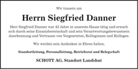Wir trauern um Herrn Siegfried Danner Herr Siegfried Danner war 42 Jahre in unserem Hause tätig und erwarb sich durch seine Einsatzbereitschaft und sein Verantwortungsbewusstsein Anerkennung und Vertrauen von Vorgesetzten, Kolleginnen und Kollegen. Wir werden sein Andenken in Ehren halten. Standortleitung, Personalleitung, Betriebsrat und Belegschaft SCHOTT AG, Standort Landshut