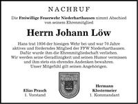 NACHRUF Die Freiwillige Feuerwehr Niederharthausen nimmt Abschied von seinem Ehrenmitglied Herrn Johann Löw Hans trat 1956 der hiesigen Wehr bei und war 70 Jahre aktives und förderndes Mitglied der FFW Niederharthausen. Dafür wurde ihm die Ehrenmitgliedschaft verliehen. Wir werden seine Geradlinigkeit und seinen Humor vermissen und ihm stets ein ehrendes Andenken bewahren. Unser Mitgefühl gilt seinen Angehörigen. Elias Prasch 1. Vorstand Hermann Klostermeier 1. Kommandant