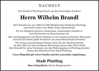 NACHRUF Der Stadtrat Plattling trauert um den ehemaligen Stadtrat Herrn Wilhelm Brandl Herr Brandl war von 1990 bis 2008 Mitglied des Stadtrates Plattling und wirkte dabei zum Wohle seiner Heimatstadt. Er war Mitglied mehrerer Ausschüsse, insbesondere brachte er sein Fachwissen im Bauausschuss ein. Mit viel Engagement und Kraft widmete er sich seinem politischen Ehrenamt und hat sich dabei große Verdienste um seine Heimatstadt erworben. Für seinen unermüdlichen Einsatz ehrte ihn der Stadtrat bereits im Jahr 2007 mit dem Goldenen Ehrenring und im Jahr 2010 erhielt Herr Brandl für seine Verdienste um den Wohnungsbau in Plattling darüber hinaus den Ehrenbrief der Stadt Plattling. Unser Mitgefühl gilt seiner Familie und den trauernden Angehörigen. Stadt Plattling Hans Schmalhofer, Erster Bürgermeister
