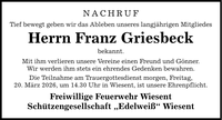 NACHRUF Tief bewegt geben wir das Ableben unseres langjährigen Mitgliedes Herrn Franz Griesbeck bekannt. Mit ihm verlieren unsere Vereine einen Freund und Gönner. Wir werden ihm stets ein ehrendes Gedenken bewahren. Die Teilnahme am Trauergottesdienst morgen, Freitag, 20. März 2026, um 14.30 Uhr in Wiesent, ist unsere Ehrenpflicht. Freiwillige Feuerwehr Wiesent Schützengesellschaft "Edelweiß" Wiesent