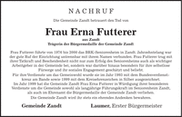 N A C H R U F Die Gemeinde Zandt betrauert den Tod von Frau Erna Futterer aus Zandt Trägerin der Bürgermedaille der Gemeinde Zandt Frau Futterer führte von 1976 bis 2000 das BRK-Seniorenheim in Zandt. Jahrzehntelang war der gute Ruf der Einrichtung untrennbar mit ihrem Namen verbunden. Frau Futterer trug mit ihrer Tatkraft und Bescheidenheit nicht nur zum Erfolg des Seniorenheims auch als wichtiger Arbeitgeber in der Gemeinde bei, sondern war darüber hinaus besonders für ihre selbstlose Fürsorge und ihr soziales Engagement geschätzt und beliebt. Für ihre Verdienste um das Gemeinwohl wurde sie im Jahr 1993 mit dem Bundesverdienstkreuz am Bande sowie 1999 mit dem Kreisehrenzeichen in Silber ausgezeichnet. Im Jahr 1999 hat die Gemeinde Zandt Frau Erna Futterer in Würdigung ihrer besonderen Verdienste um die Gemeinde sowohl als langjährige Führungskraft im Seniorenheim Zandt, als auch im Ehrenamt die Bürgermedaille der Gemeinde Zandt verliehen. Die Gemeinde Zandt wird ihr stets ein ehrendes Andenken bewahren. Gemeinde Zandt Laumer, Erster Bürgermeister