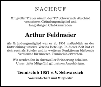 NACHRUF Mit großer Trauer nimmt der TC Schwarzach Abschied von seinem Gründungsmitglied und langjährigen Clubkameraden Arthur Feldmeier Als Gründungsmitglied war er ab 1957 maßgeblich an der Entwicklung unseres Vereins beteiligt. In dieser Zeit hat er sich auch als Spieler und in weiteren Funktionen bleibende Verdienste für unseren Tennisclub erworben. Wir werden ihn in ehrenvoller Erinnerung behalten. Unser tiefes Mitgefühl gilt seinen Angehörigen. Tennisclub 1957 e.V. Schwarzach Vorstandschaft und Mitglieder