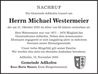 Nachruf Die Gemeinde Adlkofen trauert um Herrn Michael Westermeier der am 31. Oktober 2025 im Alter von 88 Jahren verstorben ist. Herr Westermeier war von *** Mitglied des Gemeinderates Adlkofen. Neben dem kommunalen Ehrenamt engagierte er sich langjährig aktiv in mehreren Vereinen seiner Heimatgemeinde. Unser tiefes Mitgefühl gilt seiner Familie. Wir werden ihm stets ein ehrendes Andenken bewahren. Adlkofen, 10. November 2025 Gemeinde Adlkofen Rosa-Maria Maurer, Erste Bürgermeisterin