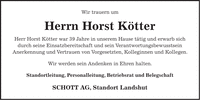 Wir trauern um Herrn Horst Kötter Herr Horst Kötter war 39 Jahre in unserem Hause tätig und erwarb sich durch seine Einsatzbereitschaft und sein Verantwortungsbewusstsein Anerkennung und Vertrauen von Vorgesetzten, Kolleginnen und Kollegen. Wir werden sein Andenken in Ehren halten. Standortleitung, Personalleitung, Betriebsrat und Belegschaft SCHOTT AG, Standort Landshut