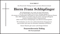 NACHRUF Die Feuerwehr Töding trauert um ihren Ehrenvorstand Herrn Franz Schlüpfinger Hr. Schlüpfinger war mehr als fünf Jahrzehnte bei der Freiwilligen Feuerwehr Töding engagiert. Ab seinem 16. Lebensjahr übernahm er stets Funktionen im aktiven Dienst. Seit 1988 führte er 14 Jahre lang als erster und darauffolgend zweiter Vorstand unsere Gemeinschaft. 2003 wurde Franz Schlüpfinger zum Ehrenvorstand geehrt. Wir bedanken uns für sein außerordentliches Engagement und werden ihm stets ein ehrendes Andenken bewahren. Seiner Familie gilt unser aufrichtiges Beileid. Feuerwehrverein Töding Die Vorstandschaft