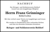 Nachruf Der Krieger- und Soldatenverein Hofdorf trauert um sein langjähriges Mitglied Herrn Franz Grinninger Hofdorf-Leithen Mit ihm verliert unser Verein ein langjähriges und treues Mitglied. Wir werden in Dankbarkeit stets verbunden bleiben und ihm ein ehrendes Gedenken bewahren. Krieger- und Soldatenverein Hofdorf