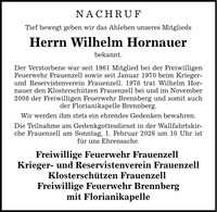 nachrufTief bewegt geben wir das Ableben unseres Mitglieds Herrn Wilhelm Hornauerbekannt.Der Verstorbene war seit 1961 Mitglied bei der Freiwilligen Feuerwehr Frauenzell sowie seit Januar 1970 beim Krieger- und Reservistenverein Frauenzell. 1978 trat Wilhelm Hornauer den Klosterschützen Frauenzell bei und im November 2008 der Freiwilligen Feuerwehr Brennberg und somit auch der Florianikapelle Brennberg. Wir werden ihm stets ein ehrendes Gedenken bewahren.Die Teilnahme am Gedenkgottesdienst in der Wallfahrtskirche Frauenzell am Sonntag, 1. Februar 2026 um 10 Uhr ist für uns Ehrensache.Freiwillige Feuerwehr Frauenzell Krieger- und Reservistenverein FrauenzellKlosterschützen Frauenzell Freiwillige Feuerwehr Brennbergmit Florianikapelle