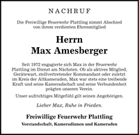 NACHRUF Die Freiwillige Feuerwehr Plattling nimmt Abschied von ihrem verdienten Ehrenmitglied Herrn Max Amesberger Seit 1972 engagierte sich Max in der Feuerwehr Plattling im Dienst am Nächsten. Ob als aktives Mitglied, Gerätewart, stellvertretender Kommandant oder zuletzt im Kreis der Altkameraden, Max war stets eine treibende Kraft und seine Kameradschaft und seine Verbundenheit prägten unseren Verein. Unser aufrichtiges Mitgefühl gilt seinen Angehörigen. Lieber Max, Ruhe in Frieden. Freiwillige Feuerwehr Plattling Vorstandschaft, Kameradinnen und Kameraden