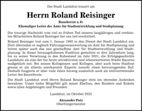 Die Stadt Landshut trauert um Herrn Roland Reisinger Bauoberrat a. D. Ehemaliger Leiter des Amts für Stadtentwicklung und Stadtplanung Die traurige Nachricht vom viel zu frühen Tod unseres langjährigen und verdienten Mitarbeiters Roland Reisinger hat uns tief erschüttert. Roland Reisinger trat zum 1. Januar 1992 in den Dienst der Stadt Landshut ein. Dort übernahm er sogleich Führungsverantwortung im Amt für Stadtplanung und leitete später auch das neu geschaffene Amt für Stadtentwicklung und Stadt­planung. In dieser herausgehobenen Funktion gestaltete er drei Jahrzehnte lang, bis zu seiner Versetzung in den Ruhestand im Jahr 2021, die Erfolgsgeschichte Landshuts als eine der bis heute attraktivsten und lebenswertesten Städte Bayerns maßgeblich mit. Bei seinen Kolleginnen und Kollegen, aber auch beim Stadtrat ­genoss er als allseits anerkannter Experte zurecht einen hervorragenden Ruf. ­Deshalb fungierte er über viele Jahre hinweg zusätzlich auch als stellvertretender Leiter des Baureferats. Die Stadt Landshut wird Herrn Roland Reisinger stets ein ehrendes Andenken ­bewahren. Unser tiefes Mitgefühl gilt seiner Ehefrau, den Kindern und Enkeln ­sowie allen Angehörigen und Freunden. Landshut, im Oktober 2025 Alexander Putz Oberbürgermeister